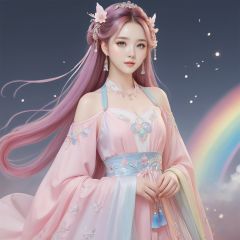 extremely detailed CG, 8k_wallpaper, masterpiece, watercolor_, medium, beautiful detailed starry sky, cinmatic lighting, princess, very long rainbow hair, looking at viewer, full body, frills, far from viewer, extremely detailed face, an extremely delicate and beautiful girl, extremely detailed cute anime face, extremely detailed eyes, extremely detailed body, ultra detailed, bare stomach, bare shoulder, small breast, sideboob, floating and rainbow hair, Iridescence and rainbow hair, Iridescence and rainbow eyes, beautiful detailed hair, beautiful detailed dress, dramatic angle, expressionless, big top sleeves, frills, blush, ahoge, hanfu, Chinese horse face skirt, illustration, best quality