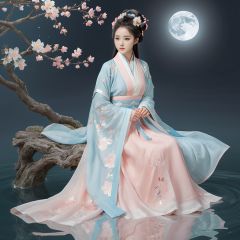 masterpiece, HanFu, 1 girl, (Blue Han suit:1.1), Look at me, incredibly_absurdres, refined rendering, night, among stars, (full moon:1.3), sitting on the tree, Black hair, little double bun, floating ribbon, (peach blossom:1.2), flowers, tree, flower, Petals on water, floating Petals, highly detailed, HanFu, CG unity, perfect hands, Mid-Autumn Festival, textured skin, super detail, best quality