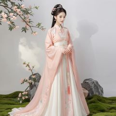 masterpiece, HanFu, 1 girl, solo, Lovely, Look at me, jewelry, necklace, hair ornament, Tea hair, full body, dress, chinese clothes, standing, tiara, White background wall, Peach tree, Potted plant, Petals on the ground, Landscape mural, Photographic sets, Light and shadow, Chinese clothing with gradual change of color, textured skin, super detail, best quality