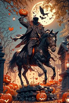1boy,riding,horse,headless,pumpki head,male focus,moon,horseback riding,tree,night,jacket,belt,outdoors,full moon,hood,bare tree,tombstone,lantern,solo,cloak,