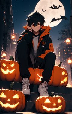 wsj_1, 1boy, jack-o'-lantern, male focus, bat \(animal\), pumpkin, jacket, solo, moon, sitting, night, shoes, sneakers, looking at viewer, sky, white footwear, pants, black hair, full moon, short hair, outdoors, hair between eyes, orange eyes, long sleeves, black pants, halloween, black jacket, hood, night sky, closed mouth, full body, bird, bangs, building, star \(sky\), cloud, brown hair, glowing<lora:MW_wsj_v1:0.8>