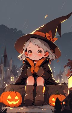 night, jack-o'-lantern, hat, witch hat, pumpkin, 1girl, blush, short hair, boots, looking at viewer, brown eyes, gloves, sitting, halloween, brown footwear, rain, parted lips, long sleeves, solo, brown gloves, grey hair, child, outdoors,bat wings,