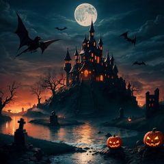 万圣节,Halloween Background,moon, jack-o'-lantern, night, full moon, bat \(animal\), graveyard, halloween, pumpkin, cloud, water, bird, sky, no humans, castle, tombstone