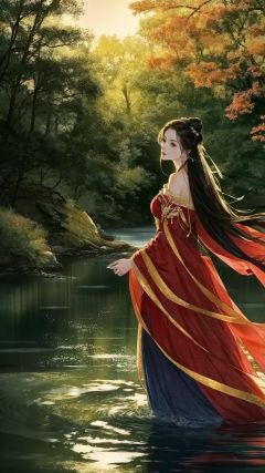 (8k, RAW photo, best quality, masterpiece:1.2),(super realistic, photo-realistic:1.3), ultra-detailed, extremely detailed cg 8k wallpaper,hatching (texture),skin gloss,light persona,(crystalstexture skin:1.2), (extremely delicate and beautiful), gf-hd, 1girl, long hair, solo, black hair, hanfu, dress, hair bun, red dress,night, beautiful detailed water,full body,  <lora:1017gf-000008:0.8>