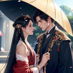 (8k, RAW photo, best quality, masterpiece:1.2),ultra-detailed, extremely detailed cg 8k wallpaper,hatching (texture),skin gloss,light persona,1girl, 1boy, beads, umbrella, black hair, detached sleeves, jewelry, bald, hetero, hair ornament, petals, looking at another1male, hanfu, <lora:1017gf-000018:0.5>