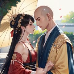 (8k, RAW photo, best quality, masterpiece:1.2),ultra-detailed, extremely detailed cg 8k wallpaper,hatching (texture),skin gloss,light persona,1girl, 1boy, beads, umbrella, black hair, detached sleeves, jewelry, bald, hetero, hair ornament, petals, looking at another1male, hanfu, <lora:1017gf-000018:0.6>