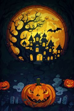 tree,Fence,tombstone,monster,Bats,full moon,Pumpkin lantern