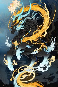 (best quality,4k,8k,highres,masterpiece:1.2),studio lighting,ultra-fine painting,sharp focus,physically-based rendering,extreme detailed,An ancient and majestic Chinese mythical creature,the Qilin,qilin,black body,no humans,Chinese mythology,mythical creature,celestial,regal,divine,ancient,serene,peaceful,harmonious,auspicious,ornate,graceful,elaborate design,magical,ethereal,guardian of prosperity,serenity,celestial beast,holiness,ceremonial appearance,hooves and mane,horn,divine presence,beauty and grace,auspicious creature,mythical energy,,,