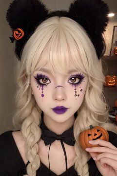 Best quality, 8k,1girl,Halloween Dressing,jack-o'-lantern, solo, facial mark, long hair, lips, looking at viewer, facepaint, exaggerated makeup, (Halloween Makeup), the whole body,