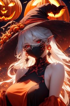 zichun,1girl,solo,earrings,jewelry,hat,red eyes,mask,jack-o'-lantern,pointy ears,looking at viewer,long hair,witch hat,halloween,upper body,dress,pumpkin,white hair,black dress,breasts,black headwear,glowing,bangs,closed mouth,witch,thorns,black background,lips,medium breasts,fire,artist name,english text,
