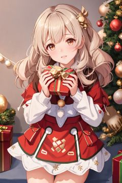 1girl, solo, photo, Snow, outside, Pine, box, christmas tree, merry christmas, holding gift, christmas lights, looking at viewer, bell, ornament, hair ornament, heart-shaped box, UHD, textured skin, high details, 16k, kamisato ayaka, klee (genshin impact)