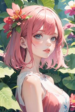 watercolor,1girl, solo, flower, hair flower, hair ornament, short hair, pink hair, lips, red hair, upper body, looking at viewer,