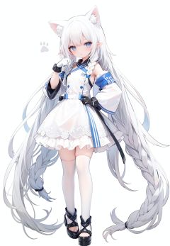 1girl, white_gloves, braid, full_body, gloves, long_hair, official_alternate_costume, pointy_ears, simple_background, solo, standing, very_long_hair, white_background, white hair, blue eyes, paw claw pose, open_mouth