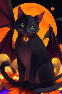 NYCuteHalloween, cat, black cat, no humans, halloween, jack-o'-lantern, happy halloween, bat (animal), wings, orange background, pumpkin, animal focus, looking at viewer, animal, green eyes, bat wings, star (symbol), :3, ghost