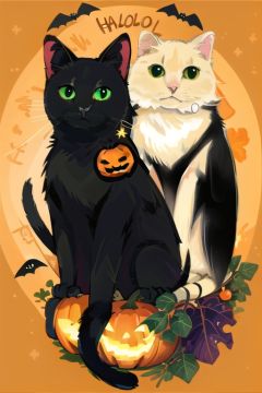 NYCuteHalloween, cat, black cat, no humans, halloween, jack-o'-lantern, happy halloween, bat (animal), wings, orange background, pumpkin, animal focus, looking at viewer, animal, green eyes, bat wings, star (symbol), :3, ghost
