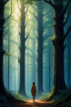 (illustration by antony gormley:0.8), 8K,HD,ultra detailed, dreamy perspective,a lady finds herself in a fantastic forest with towering trees radiating a mysterious light from their canopies. She walks down a path and encounters magical creatures and breathtaking plants, ultra detail, frosty anime stye