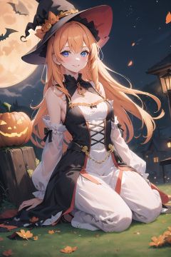 absurdres, highres, ultra detailed, (1girl:1.3) , Halloween witch, ((lovely smile)),wizard robes, wizard hat, Jack o'lantern, night, moon lighting,