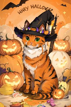 NYCuteHalloween, no humans, halloween, cat, hat, witch hat, bat (animal), happy halloween, jack-o'-lantern, pumpkin, orange background, looking at viewer, ghost, green eyes, food, animal focus, candy, animal, black headwear, :3, star (symbol), english text