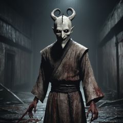 masterpiece, 1 girl, Terrible, A gloomy atmosphere, Terror effect, Indoor, Silent Hill, Valak, night, Dilapidated, Gloomy, Madhouse, Blood on the walls, The dragon is behind him, Rune, A weird smile, textured skin, super detail, best quality<lora:Halloween_V1:0.5>