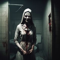 masterpiece, 1 girl, Terrible, A gloomy atmosphere, Terror effect, Indoor, Silent Hill, Valak, night, Dilapidated, Gloomy, Bathroom, Blood on the walls, A weird smile, Broken medical equipment, Gloomy lighting, textured skin, super detail, best quality<lora:Halloween_V1:0.5>