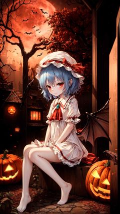 レミリア・スカーレット, ((red moon)), night, bat swarm, ((((remilia_scarlet))),Remilia Scarlet, (((1 loli))),(((9 years old))), ((little girl)), ribbon,Blue Hair,short hair,disheveled hair ,bat wing,DECAYING BAT WINGS,White Dress,red_moon, wings, solo, bloomers, hat_ribbon, barefoot, red_eyes, looking_at_viewer,