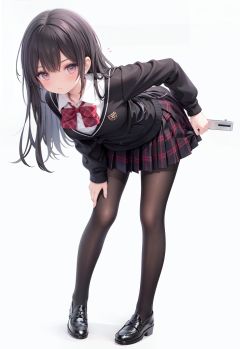 1girl, solo, pantyhose, skirt, long hair, loafers, shoes, simple background, school uniform, brown eyes, plaid, black pantyhose, plaid skirt, looking at viewer, black hair, pantyhose pull, full body, clothes pull, black footwear, pleated skirt, leaning forward, bangs, long sleeves, bent over, cardigan, bow, bowtie, standing, closed mouth, pulled by self, grey background, blush, miniskirt, red bow, sweater, **********
