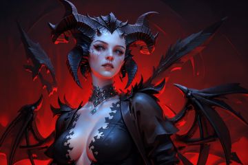 NYDarkHalloween, 1girl, horns, solo, breasts, looking at viewer, parted lips, upper body, jewelry, demon horns, choker, demon girl, necklace, red background