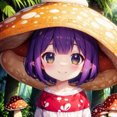Forest after rain, Amazon rainforest, lots of tropical trees, palm trees, lots of giant mushrooms, lots of poison mushrooms, red and white spotted mushrooms, purple mushrooms, yellow mushrooms, white mushrooms, explosion mushrooms, charm mushrooms, fluorescent mushrooms, (1 loli, upper body), (light smile), (close-up)(monsterification:1.3), (1 giant mushroom_girl, wearing Spotted dress, spotted mushroom hair), (spotted mushroom hat:1.2), (upper body), (cute face), beautiful eyes(detailed light), (extremely delicate and beautiful), volume light, best shadow, flash, Depth of field
