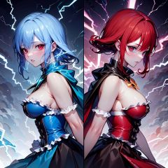 ((best quality)), ((masterpiece)), ((ultra-detailed)), (illustration), (detailed light), (an extremely delicate and beautiful),(cowboy shot), (2 girls:1.3), [(confrontation split screen theme)::0.35],/=(left-side<(girl a<((spread lots of red_Lightning on cape),(spread lots of red Lightning on frills bustier))> and red hair and(Lightning strike and (Electric shock:1.25)))>),(Detailed anime face),glowing pupil,/=(Back to back:1.2),(yuri:0.8),(Lightning-pov:1.3),/=(right-side<(girl b<((spread lots of blue_Lightning on cape),(spread lots of blue Lightning on frills bustier))> and blue hair and (Lightning strike and (Electric shock:1.25)))>),(Detailed anime face),glowing pupil,/=(night sky background),(cloudy sky),((electricity)),((wind)),Depth of Field,best-lighting,volumetric-light,