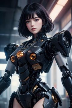 centered, upper body, masterpiece, | 1girl, solo, beautiful face, pale skin, (black hair), medium hair, full body, robotic legs, robotics arms, robotic body, robotic hands, futiristic, robotic, mechanical, armored, sitting, pure face, (black robotic body), mecha, | bokeh, depth of field, vaporwave colors scheme, coocolor, 11