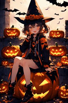 bat,halloween,1girl,jack-o'-lantern,ghost,Sit on a pumpkin,castle,demon,ghost,candy,fangs