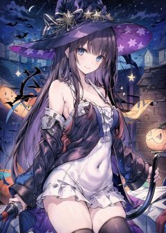long_island\(azur lane\),long_hair,blue_eyes,black hair, halloween_costume,black_legwear,witch_hat,white skirt,night, night sky, rooftop, sky, skyscraper, smile, solo, stage, star sky, starry sky, masterpiece, best quality, extremely detailed face, sharp details, high contrast, 1girl