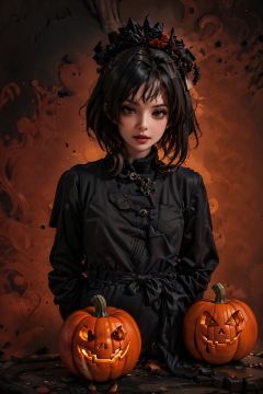 1girl, solo, black hair,Pumpkin lantern, Tombstone, Fence, Moonlight, looking at viewer, short hair, parted lips, red lips, upper body, blue background, black eyes, lips, shirt, teeth, sweater, turtleneck, bangs, simple background, black shirt, makeup, lipstick, UHD, anatomically correct, ccurate, textured skin, 16k