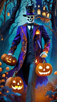 (Halloween elements) (European and American fantasy style) (Advanced colors) (Intricate details) On this mysterious Halloween night, a gentleman appears in the scene and travels through the forest. Clothes with pumpkin heads and ghost shapes are full of holiday fantasy. He was holding candy in one hand and burning with fire in the other.