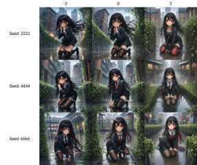 ((masterpiece)), ((best quality)), (ultra-detailed), (illustration), ((an extremely delicate and beautiful)), beautiful detailed eyes,wide shot,((1girl)),(solo),(red_eyes),black hair,long hair,(messy floating hair),(wet),(school uniform),((black stocking)),(kneeling:1.4),Hands on the ground,(City),(Vines entwined buildings in the city:1.3),((rainy days)),(rain), <lora:SDXL Detail:-2>