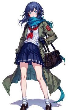 (masterpiece:1.3), (the best quality:1.2), (super fine illustrations:1.2), (Masterpiece), high quality, high detail,(white background:1.2), looking at viewer, (SOLO:1.4),outline,,simple background, fu hua, blue_eyes, hair_between_eyes, (white earmuffs)、pleated skirt,blue skirt, skirt,,school uniform, ((serafuku,)), brown footwear,shoes, (((loose socks,))) white scarf,scarf,scarf over mouth, neckerchief, plaid scarf,( jacket,brown coat, open coat),bag,school bag , bag charm, duffel bag,,shoulder bag, gloves, silk,very_long_hair