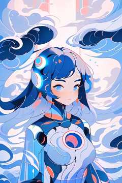 1girl, (humanoid robot:1.2), liuyun, waves, long hair, floating hair, hair flower, upper body, looking at viewer,  <lora:liuyunV5:0.7>, holographic, <lora:holographicV1:0.6>