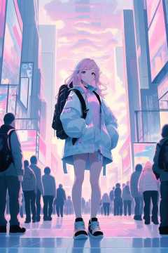 1girl, full body, jacket, backpack, modern city, pastel colors, pink and white, looking at viewer, crowd, cloudy sky, <lora:pastelcolorV1:0.65>