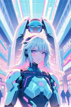 1girl, humanoid robot, long hair, upper body, mall, futuristic, pastel colors, looking at viewer, neon trim, fighting stance, <lora:pastelcolorV1:0.65>,