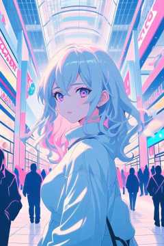 1girl, upper body, mall, futuristic, pastel colors, looking at viewer, crowd, daylight, pink and blue, <lora:pastelcolorV1:0.65>,