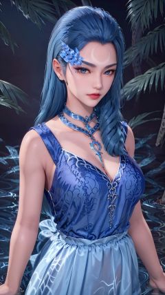 A woman with blue hair and a blue dress is posing for a photo, her arm extended, 1 girl, clothing, jewelry, long hair, outdoor, tree, necklace, solo, a woman posing with blue hair and blue clothes, 1 girl, necklace, solo, water element