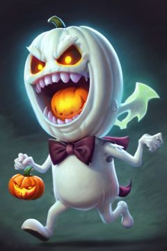 ghost, mushroom, glowing, bowtie, no humans, halloween, bow, glowing eyes, jack-o'-lantern, pumpkin, night, teeth, running, holding, sharp teeth, axe, tongue, open mouth, tongue out, <lora:万圣节:0.75>,