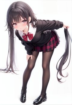 1girl, solo, pantyhose, skirt, long hair, loafers, shoes, simple background, school uniform, brown eyes, plaid, black pantyhose, plaid skirt, looking at viewer, black hair, pantyhose pull, full body, clothes pull, black footwear, pleated skirt, leaning forward, bangs, long sleeves, bent over, cardigan, bow, bowtie, standing, closed mouth, pulled by self, grey background, blush, miniskirt, red bow, sweater, **********