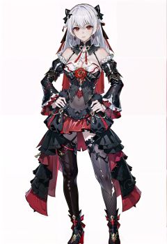 8k, best quality, masterpiece, (ultra-detailed:1.1), (high detailed skin), (full body:1.2), white background, standing, looking at viewer, solo, hand on hip, <lora:shiyue2-v100-000028:0.8:lbw=OUTALL>, shiyue, red eyes, breasts, long hair, cleavage, black dress, white hair, thighhighs, hair ornament, bare shoulders, detached sleeves, jewelry, earrings, red Wedding Veil, (white background, simple background,:1.2), <lora:EnvyBetterHands LoCon_beta2 辅助:0.55>, ( good hands, nice hands:0.5), (beautiful_face), ((intricate_detail)), clear face, ((finely_detailed)), fine_fabric_emphasis, ((glossy)), full_shot,