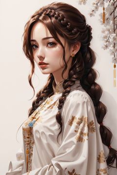 1 girl, ( brown long hair:1.3),(two braid:1.2),,mole under eyes,earrings,huanshuyifu,white background,(white chinese clothes:1.3),hide hand behind back,(((masterpiece,best quality))),((good structure,Good composition,good atomy)), ((clear, original,beautiful)), watercolor