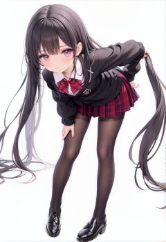 1girl, solo, pantyhose, skirt, long hair, loafers, shoes, simple background, school uniform, brown eyes, plaid, black pantyhose, plaid skirt, looking at viewer, black hair, pantyhose pull, full body, clothes pull, black footwear, pleated skirt, leaning forward, bangs, long sleeves, bent over, cardigan, bow, bowtie, standing, closed mouth, pulled by self, grey background, blush, miniskirt, red bow, sweater, **********