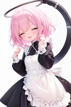 1girl, solo, apron, halo, hair over one eye, closed eyes, smile, white background, dress, white apron, simple background, long sleeves, multicolored hair, braid, open mouth, blue hair, alternate costume, blush, bangs, :d, pink hair, black dress, ribbon, frilled dress, enmaided, short hair, hand up, colored inner hair