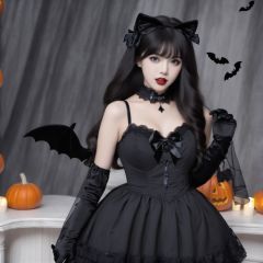 HDR,UHD,8K, best quality, masterpiece, absurdres,extremely detailed, BREAKhalloweencoser, wan5, 1girl, black hair, dress, solo, bat \(animal\), gothic, black dress, long hair, hand on hip, gloves, black nails, bare shoulders, lolita fashion, gothic lolita, lace, bangs, black eyes, looking at viewer, sleeveless, sleeveless dress, bow, cross, lips, fingerless gloves, copyright name, black gloves, hair bow, breasts, choker, elbow gloves, parted lips, grey background, standing, lace trim, nail polish, lace-trimmed dress, black bow, red lips, lace gloves, black theme, english text, open mouth, teeth, realistic, halloween, artist nameBREAKPumpkin, pumpkin lantern,BREAK<lora:halloweencoser-000008:1>