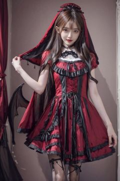 red dress,,vampire,wings,dress, gothic lolita, frills, lace, little red riding hood \(grimm\), lolita fashion,