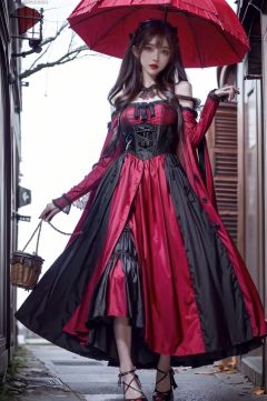red dress,black dress,umbrella,vampire,wings,dress, gothic lolita, frills, lace, little red riding hood \(grimm\), lolita fashion, Halloween background, pumpkin
